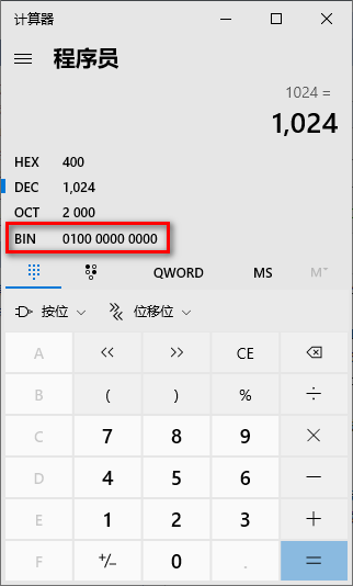 如1024转二进制为 100 0000 0000,即1024为2的10次方: