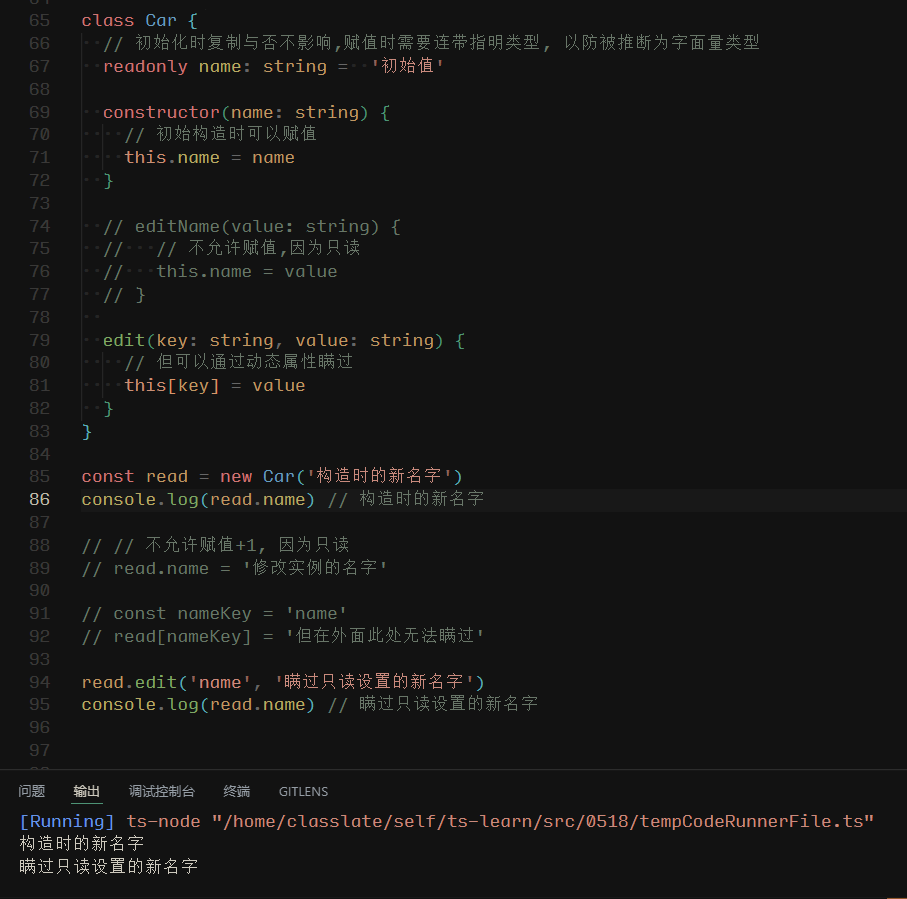 通过readonly 修饰的属性除了初始时赋值以及在constructor 中进行赋值外,在其它位置进行赋值是不允许的, 但像下面这样以动态属性动态传输属性名称的方式可以瞒过类型检查,对 readonly 修饰的属性进行赋值,
